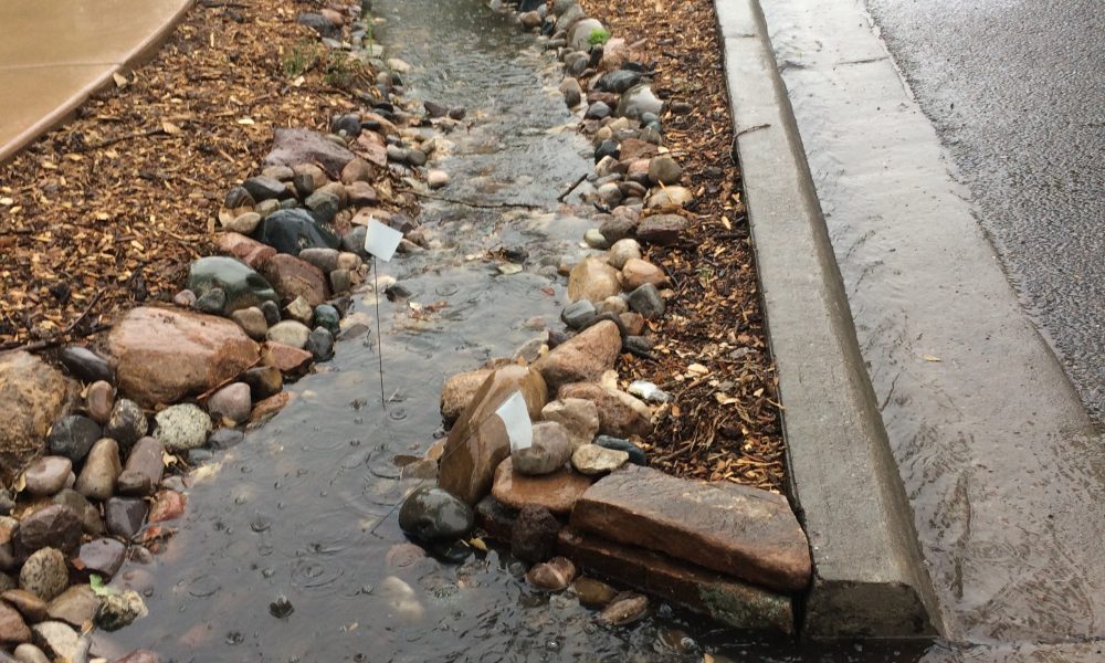 Road debris, de-icing scoria rock, glass, branches and oil collect within the sediment trap.  Four-feet wide and four-inches below grade, material drops down, allowing cleaner water to enter into the rain garden.  Simple ones, such as this one, are filled with 4-inch to 12-inch rough edge rock.  This one captured 50 gallons of material when ...